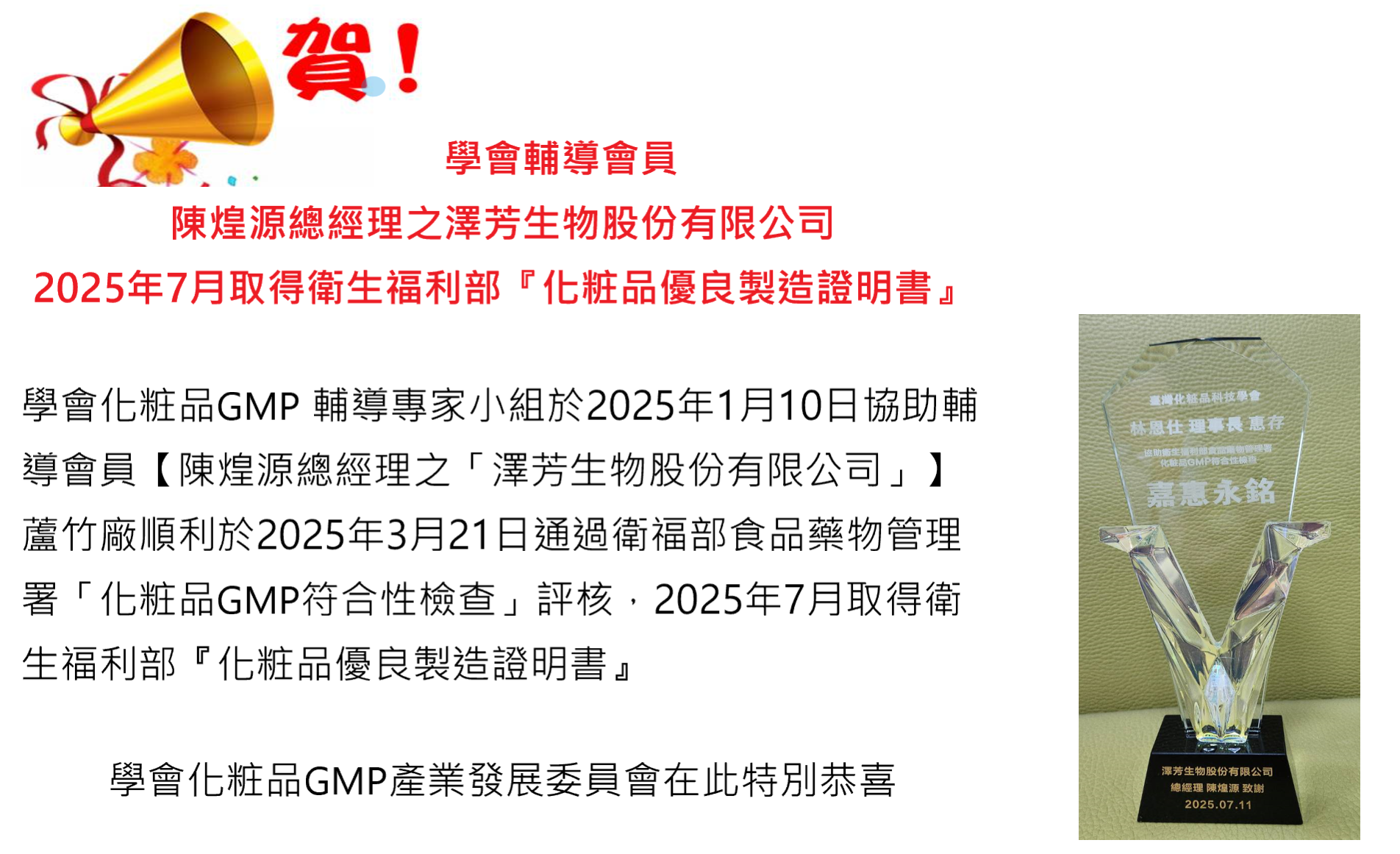 【賀】學會輔導會員陳煌源總經理之澤芳生物股份有限公司 通過「衛生福利部食品藥物管...