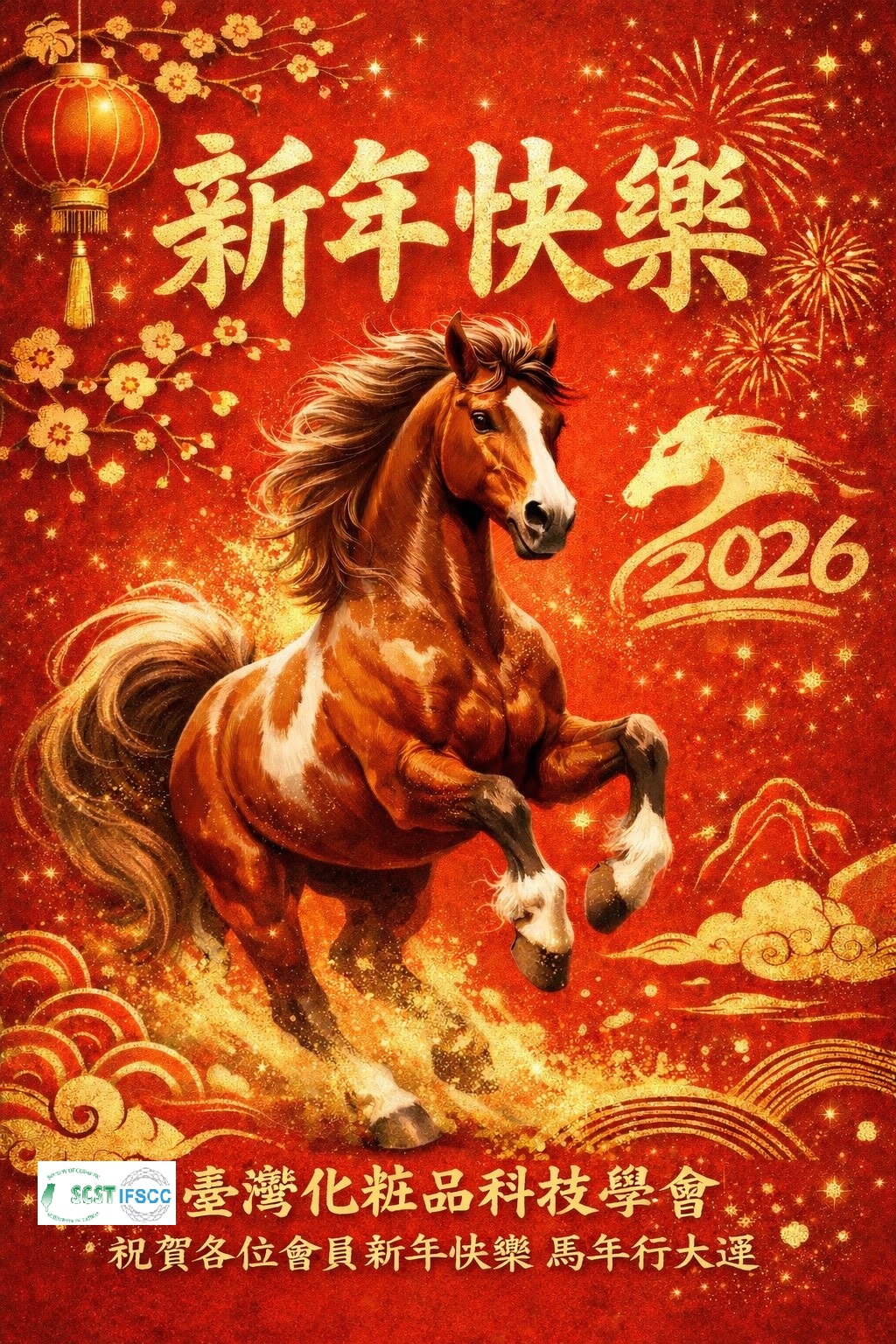 親愛的會員: 感謝大家過去一年對學會的支持與陪伴, 臺灣化粧品科技學會祝賀各位會員, 新年快樂 馬年行大運! 願新的一年 事業奔騰、研發順利、合作拓展, 攜手推動臺灣化粧品科技再創高峰! 林恩仕 理事長暨全體理監事 敬賀 臺灣化粧品科技學會 秘書處 Society of Cosmetic Scientists of Taiwan