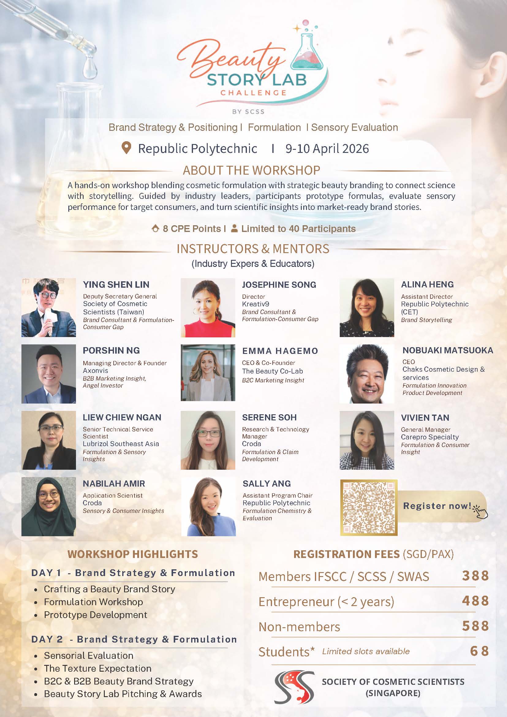 ABOUT THE WORKSHOPA hands-on workshop blending cosmetic formulation with strategic beauty branding to connect science with storytelling. Guided by industry leaders, participants prototype formulas, evaluate sensory performance for target consumers, and turn scientific insights into market-ready brand stories.